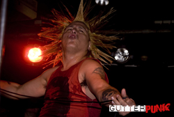 The place was dead! This really surprised us as there are normally quite a few people milling around at this time. So we had a long chat with Rat (Varukers & Discharge) about his new band 'The Vile' and listened to Chaos:Baby's soundcheck. The first band to take the stage were Chaos:Baby. The band were on quite late as only a handful of people had turned up to watch. We had never heard of Chaos:Baby but were really impressed with them as they were an excellent outfit. On some of the tracks the singer sounded very similar to an early Nina Hagen, it was a very good start to the evening.