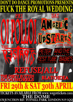 This time it was a new venue for us, The Dome, in Tufnell Park, and on the day of the Royal Wedding!Well, this gig was billed as 'F**k the Royal Wedding' and it did give us an excuse to get away from all the days nonsense and get down to some good old Punk music. As we were not sure when the gig would finish we drove up and stayed at Steve's mum's in Croydon for the night. We managed to battle through the Union Jacks on the tubes and arrived at the gig with enough time for a beer or two and a pizza. After that we bumped into Davee and Gemma and saw a number of other old faces.